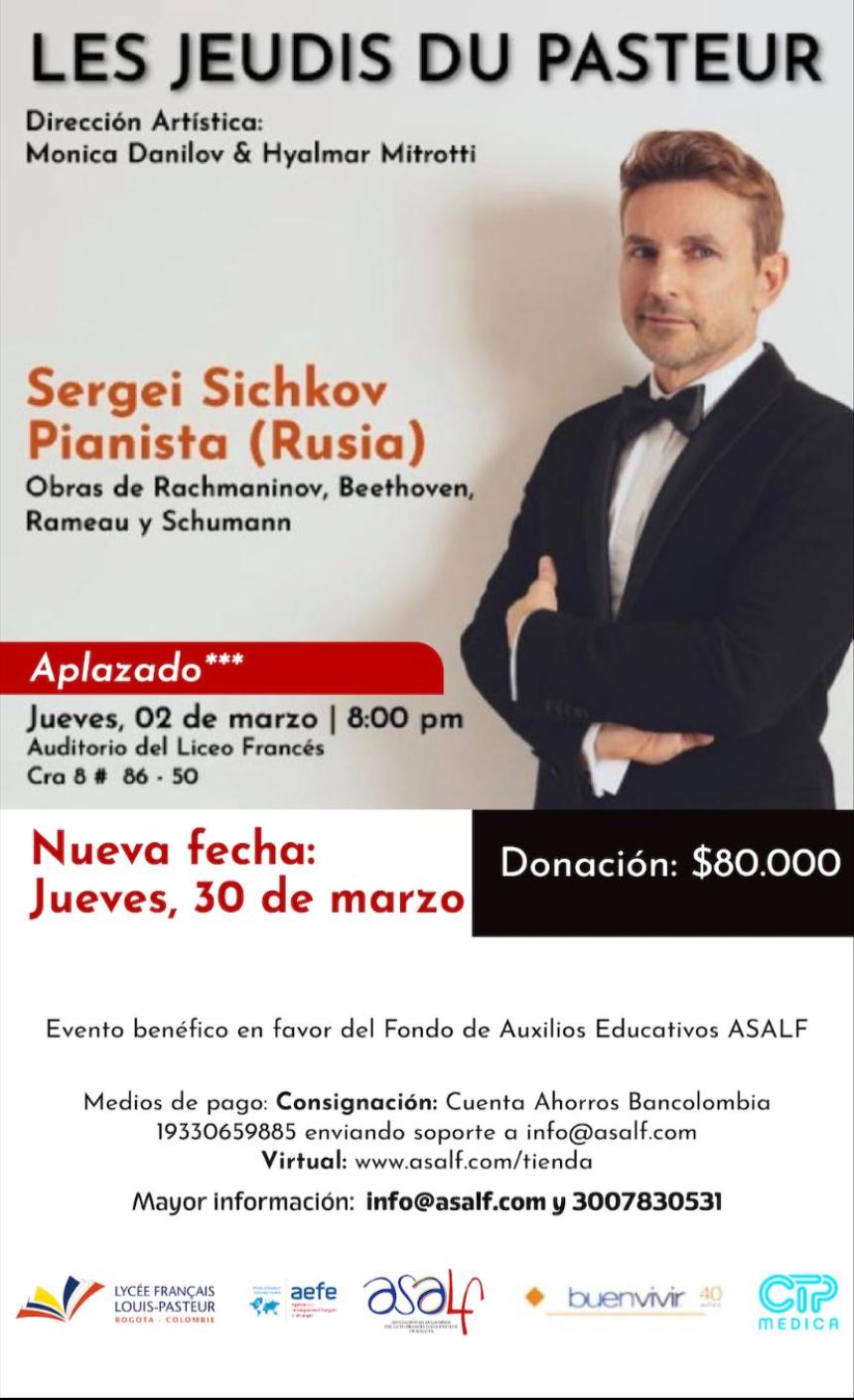 LES JEUDIS DU PASTEUR, presenta en concierto al reconocido pianista Sergei Sichkov, el Jueves 30 de Marzo, 8pm, en el auditorio del Liceo Francés (Cra 8 con 87).