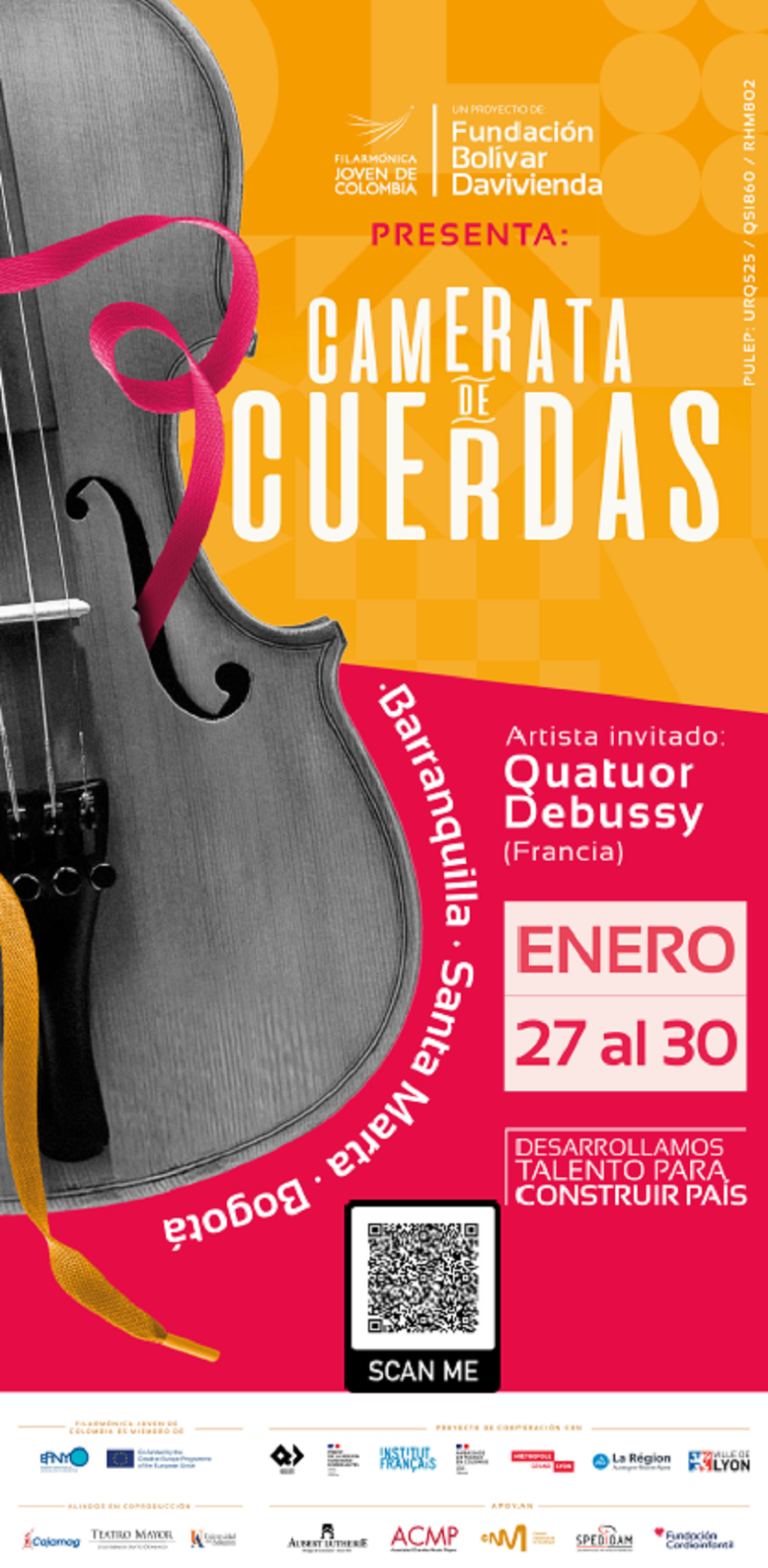 La Camerata de Cuerdas de la Filarmónica Joven de Colombia fue creada como un laboratorio para proponer nuevos formatos de creación y difusión para la música sinfónica. Junto a Quatuor Debussy, uno de los cuartetos más reconocidos de Francia, los jóvenes músicos interpretarán obras de Shostakóvich y del compositor colombiano Pedro Sarmiento.