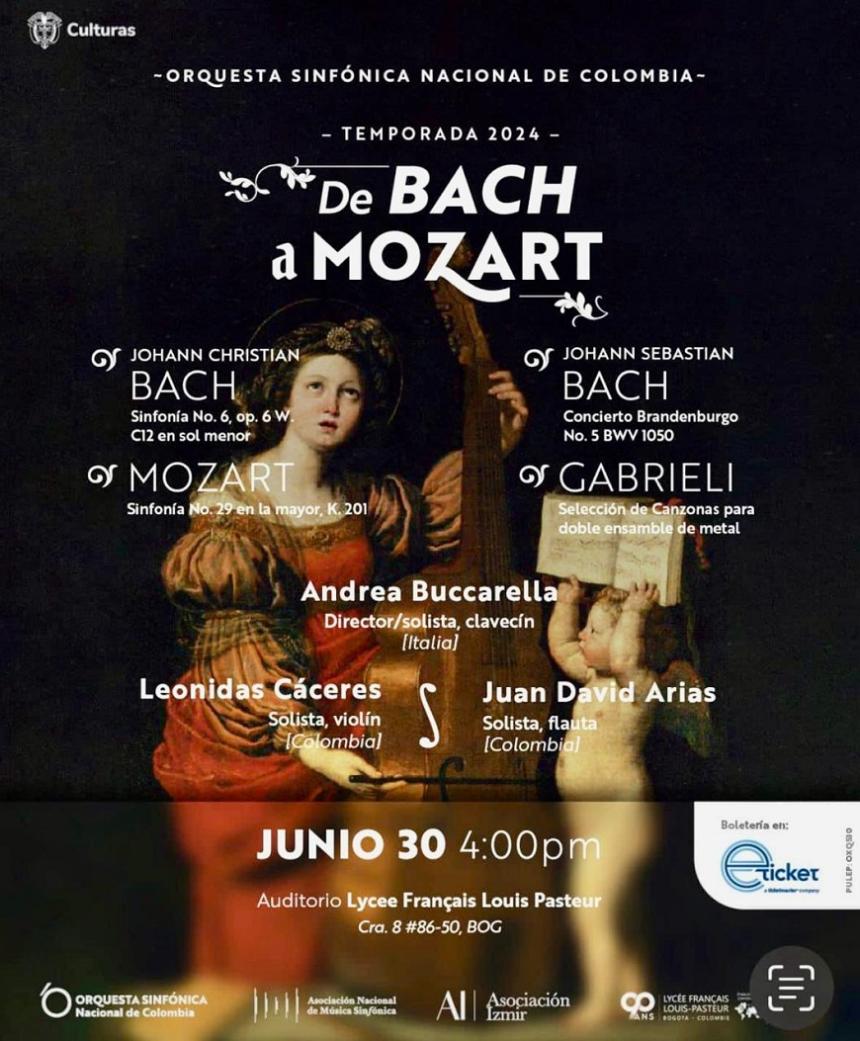 El Domingo, 30 de Junio, a las 4 p.m., vuelve la Sinfónica Nacional de Colombia al Auditorio del Lycée Français Louis Pasteur (Carrera 8 # 86-50, Bogotá) con la serie “De Bach a Mozart”.