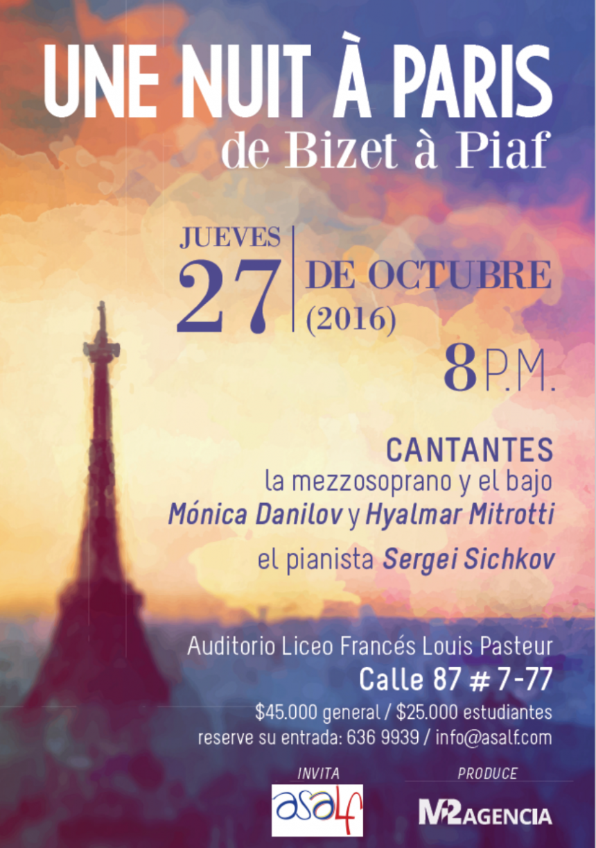 La Mezzosoprano Colombo Americana Mónica Danilov y el bajo Franco Colombiano Hyalmar Mitrotti serán los encargados, el próximo 27 de Octubre en el Auditorio del Liceo Francés Louis Pasteur, de hacer un recorrido por la música más bella de Francia que a través de lindos colores vocales y finas pisadas de piano nos cautivarán con canciones desde Bizet hasta Piaf.
