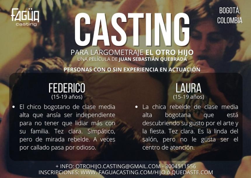 Invitamos a los exalumnos del Liceo Francés Louis Pasteur de Bogotá, que tengan hijos entre 15 y 19 años a participar en la convocatoria para el casting del largometraje del director colombiano Juan Sebastián Quebrada, EL OTRO HIJO, proyecto ganador de dos estímulos del Fondo de Cine (FDC Proimágenes) que está produciendo desde Evidencia Films (productora fundada y dirigida por el exalumno de la promoción 2001 Franco Lolli, https://evidenciafilms.com/).
