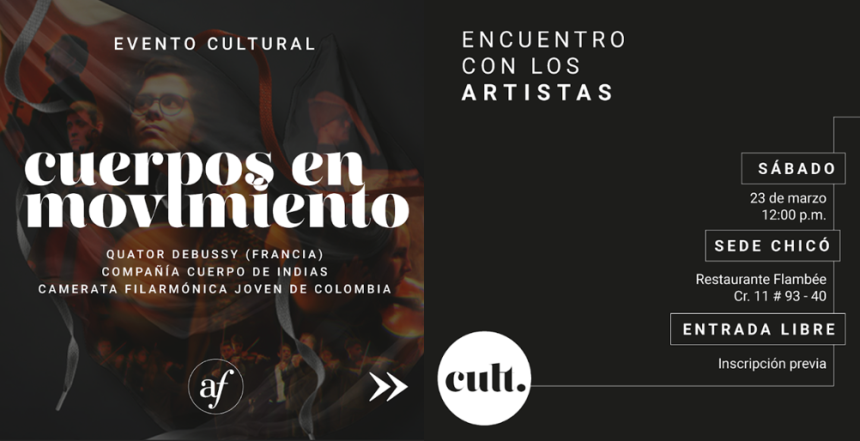 Un espacio de integración y diálogo en francés entre dos gigantes del arte: el Cuarteto Debussy y el Colegio del Cuerpo. La música y la danza. Con más de 30 años de experiencia, el Cuarteto Debussy fusiona la música clásica con diversas disciplinas, mientras que el Colegio del Cuerpo, dirigido por Álvaro Restrepo y Marie France Delieuvin, destaca en la danza contemporánea, promoviendo la educación a través del arte y la inclusión social. También contaremos con la participación de músicos de la Camerata de la Filarmónica Jóven de Colombia.