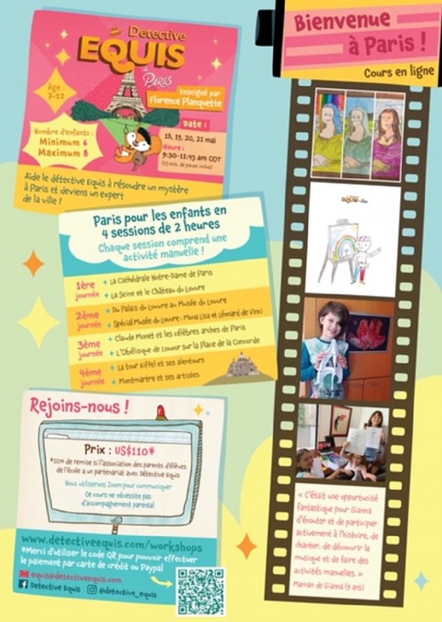 Para las vacaciones escolares del Liceo Francés del mes de mayo, El Globo de Antonia ofrecerá su curso “Detective Equis à Paris”, por Zoom, mayo 18 al 21 de 9:30-11:45 am. Los exalumnos obtendrán un descuento especial.