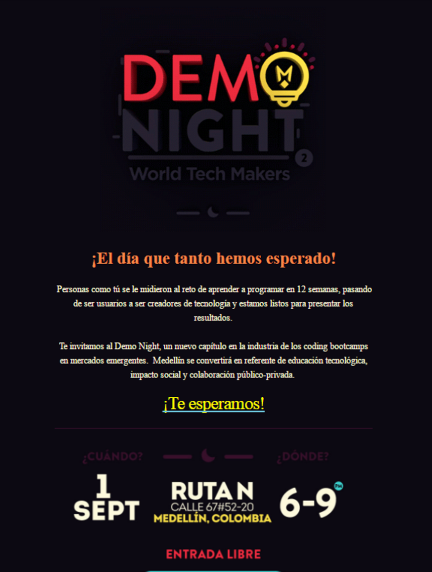 Te invitamos al Demo Night, un nuevo capítulo en la industria de los coding bootcamps en mercados emergentes. Medellín se convertirá en referente de educación tecnológica, impacto social y colaboración público-privada.