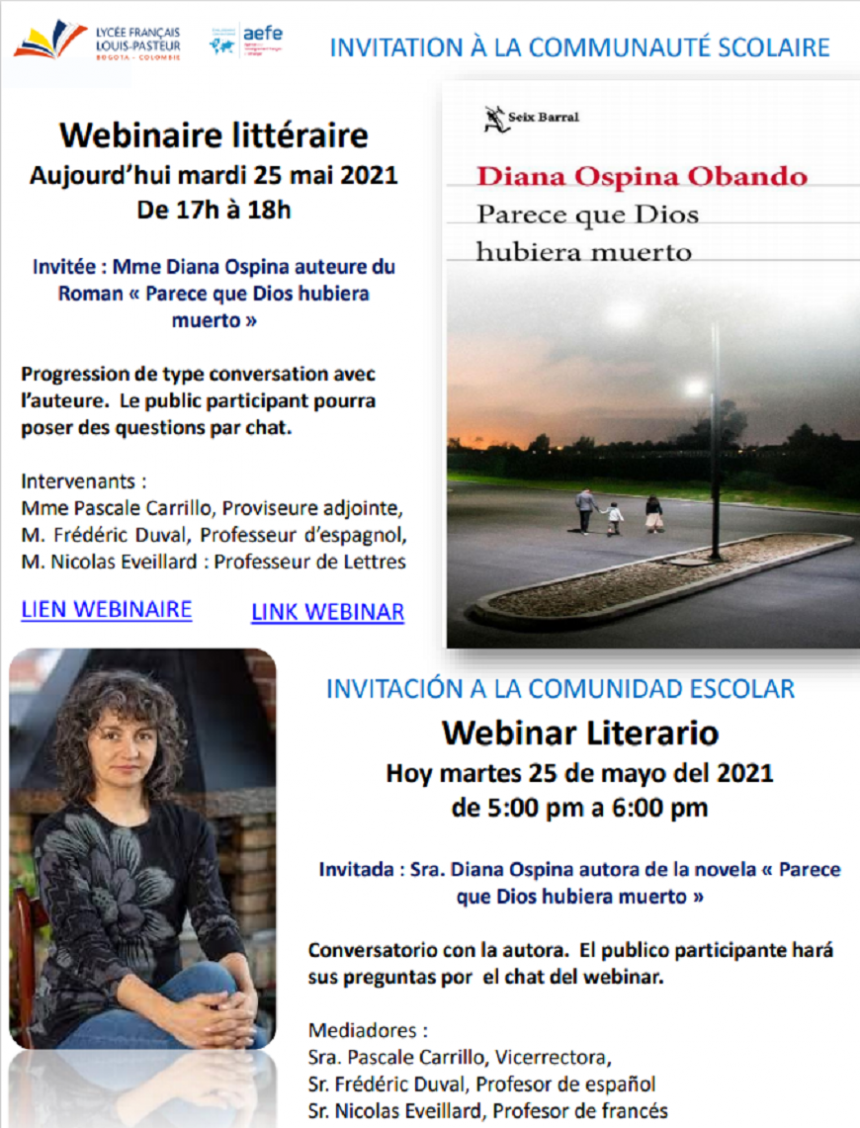 Es un placer invitarlos a nuestro primer Webinar Literario con una invitada muy conocida por nuestra comunidad: la exalumna Diana Ospina que nos presentará su última novela "Parece que Dios hubiera muerto".
