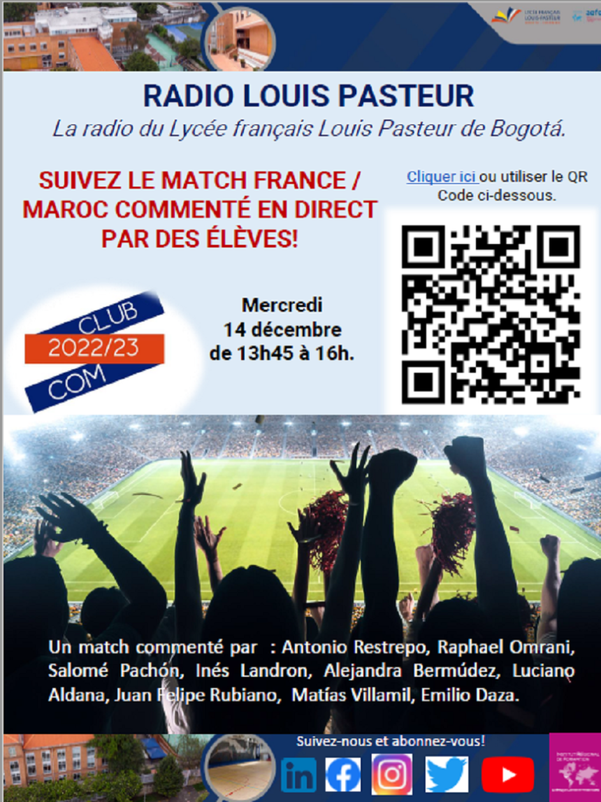 A l'occasion du Lancement de la Radio Louis Pasteur, la radio du Lycée Français Louis Pasteur de Bogotá, nos élèves volontaires vous invitent à suivre en direct leurs commentaires du Match France / Maroc qui aura lieu aujourd'hui mercredi 14 décembre de 13h45 à 16h sur le lien suivant : Ecouter la Radio Louis Pasteur