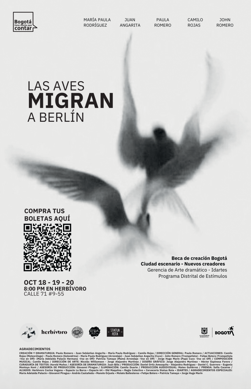 La compañía LAS AVES MIGRAN A BERLÍN presenta su ópera prima: la obra homónima Las aves migran a Berlín, Proyecto Ganador de la Beca de Creación Bogotá Ciudad Escenario - Nuevos creadores 2023 otorgada por el IDARTES.