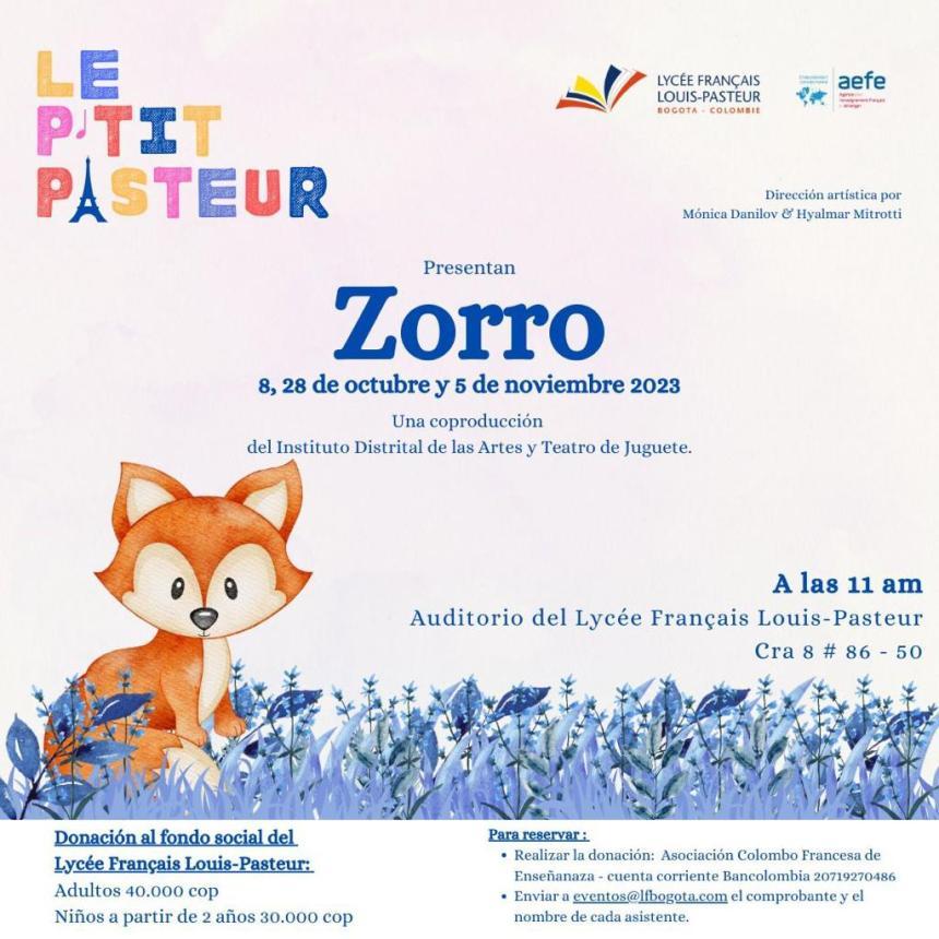 El Liceo Francés Louis Pasteur de Bogotá, en el marco de LE P'TIT PASTEUR, nos presenta el show de títeres y actores "ZORRO", obra que cuenta la historia de Zorro, quien vive con una familia humana y se cree humano. Las mascotas se ponen celosas... ¡Vengan a descubrir con sus hijos qué le sucederá a este tierno personaje!