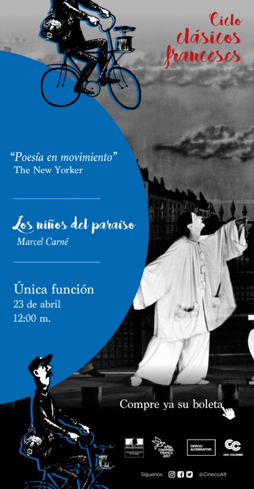 El domingo 23 de abril el turno es para "Les Enfants du Paradis/Los niños del paraíso" de Marcel Carné, nominada al premio Óscar a mejor guion original en 1946. Fue filmada durante la ocupación alemana en Francia, cuando la gente se refugiaba en el ambiente de carnaval y presenta la historia amorosa de dos actores de teatro que se enamoran de una misma mujer que está inmiscuida en un entorno criminal.