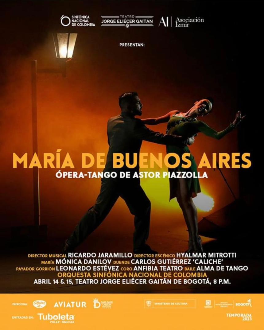 El Teatro Jorge Eliécer Gaitán, junto con la La Asociacion Izmir y la Orquesta Sinfónica de Colombia, presenta los próximos 14 y 15 de abril la ópera-tango María de Buenos Aires de Astor Piazzolla. El espectáculo es ganador del premio Opera al Parque 2019 y cuenta con la participación de La Orquesta Sinfónica Nacional de Colombia, Gina Medina y el cuerpo de baile de Alma de Tango; 6 actores, el gran Carlos Gutiérrez (Caliche), y los dos cantantes: Monica Danilov (María) y Leonardo Estevéz, de Argentina.