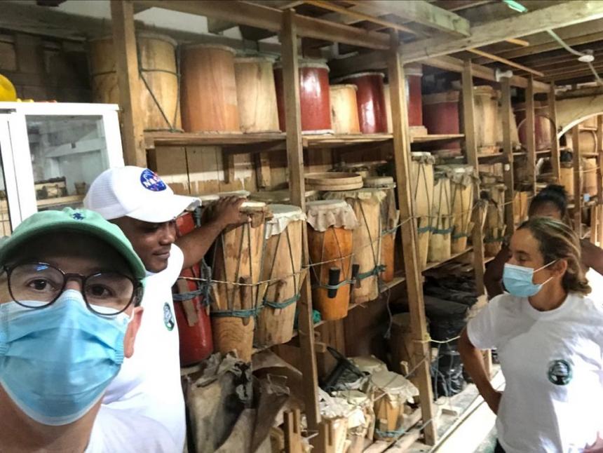 Foto: Sergio Restrepo, Alejandra de Vengoechea junto a Juan Angulo, director de Somo Jóvenes, Somos Futuro comprando los instrumentos clásicos del Pacífico en la fábrica Francisco Tenorio, ubicada en el centro de Tumaco.