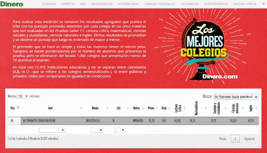 El Liceo Francés Louis Pasteur de Bogotá obtuvo el puesto 36.