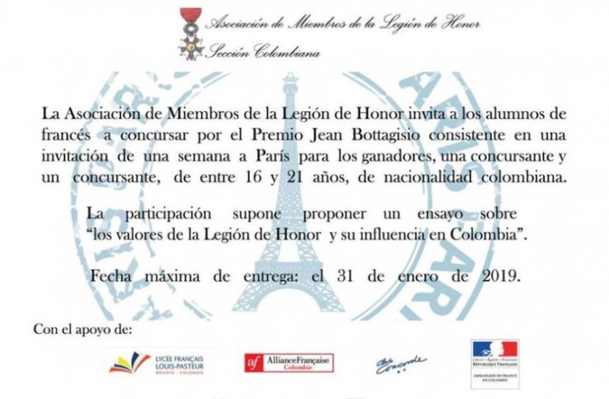 Para participar en el premio Jean Bottagisio, que lleva en su homenaje el nombre del vicepresidente de la Asociación recientemente desaparecido y quien simbolizó durante muchos años la relación profunda entre los dos países, los jóvenes deberán enviar un ensayo inédito en francés y que no haya sido presentado en otro concurso, de máximo 10 páginas en letra Times New Roman 12 a doble espacio, en el cual reflexionen sobre los principios de la Legión de Honor y su vigencia en Colombia, antes del 31 de enero de 2019.