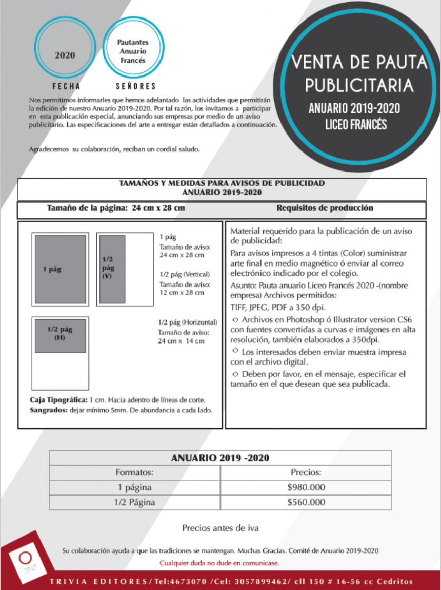 VENTA DE PAUTA PUBLICITARIA ANUARIO 2020 LICEO FRANCÉS