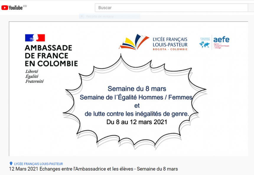 Le vendredi 12 mars les élèves du Lycée Français Louis Pasteur ont pu poser leurs questions à Mme Michèle Ramis, Ambassadrice de France en Colombie, sur les avancées des Droits des Femmes dans le monde. Une rencontre qui donne de nombreux arguments pour aborder la thématique dans la paix et le respect de l'autre.