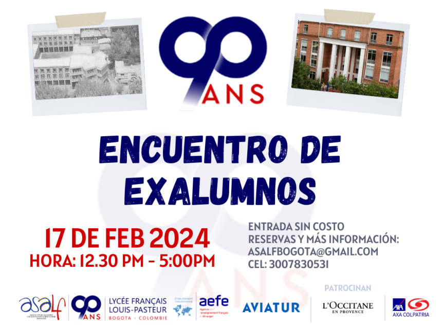 En el marco de la celebración de los 90 años del Liceo Francés Louis Pasteur de Bogotá, la Asociación de Exalumnos ASALF invita a todas las generaciones a encontrarse el próximo 17 de febrero en las instalaciones del colegio, para compartir una tarde llena de reencuentros, anécdotas, y risas. Tanto exalumnos como sus acompañantes mayores de edad, ¡Vous êtes bienvenues!