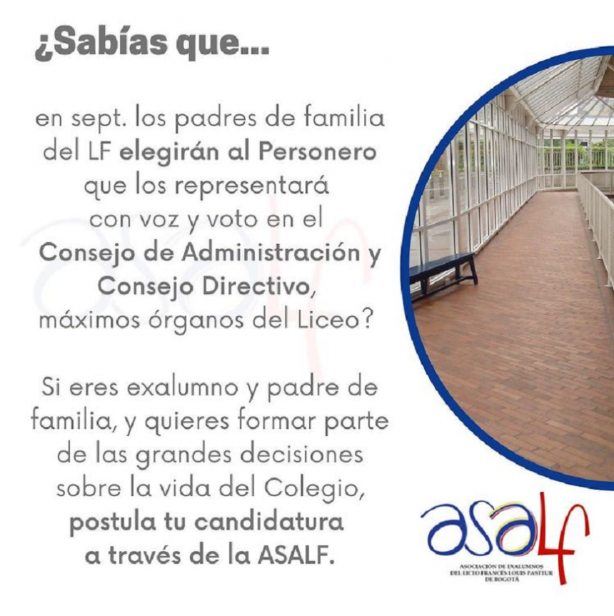 Si eres exalumno y padre de familia, y quieres formar parte de las grandes decisiones sobre la vida del Colegio, postula tu candidatura a través de la ASALF al correo info@asalf.com