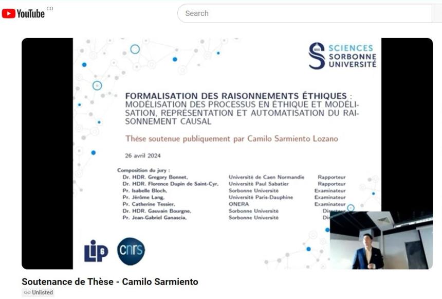 Los invitamos a visitar la sustentación de tesis del exalumno Camilo Sarmiento Lozano (Prom 2015), denominada: “Formalisation des raisonnements éthiques : modélisation des processus en éthique et modélisation, représentation et automatisation du raisonnement causal”, la cual se llevó a cabo el viernes 26 de abril de 2024 a las 9:30 a.m., en LIP6 el campus Jussieu de la Universidad de la Sorbona, torre 26, primer piso, pasillo 25-26, sala 105.