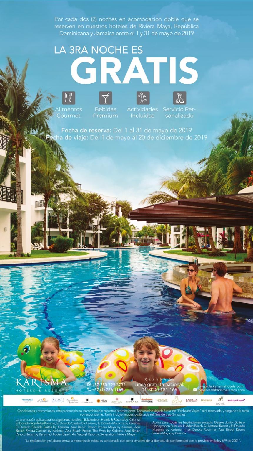 Nuestro aliado KARISMA nos trae este fabuloso descuento: tercera noche gratis en los hoteles de Riviera maya, Punta Cana y Negril. Los exalumnos del Liceo Francés de Bogotá además de la tercera noche gratis, tendrán un descuento adicional del 8% en el total de la reserva. El único requisito es hacer la reserven a través de ASALF en el correo info@asalf.com