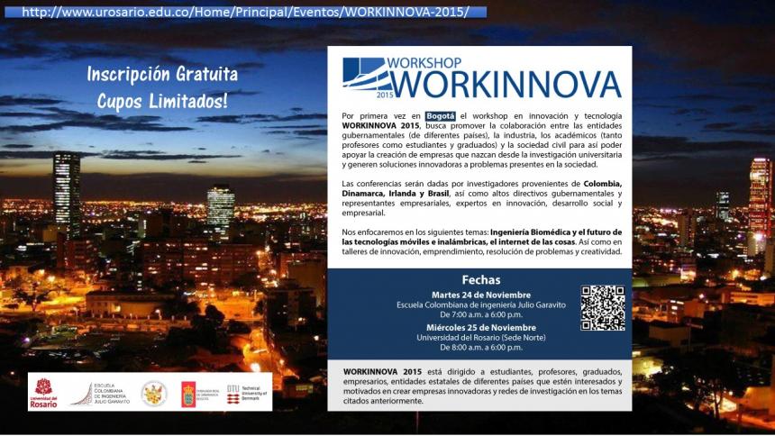 Por primera vez en Bogotá el workshop en innovación y tecnología WORKINNOVA 2015, buscamos promover la colaboración entre las entidades gubernamentales (de diferentes países), la industria, los académicos (tanto profesores como estudiantes) y la sociedad civil para así poder apoyar la creación de empresas que nazcan desde la investigación universitaria que propongan soluciones innovadoras a problemas presentes en la sociedad.